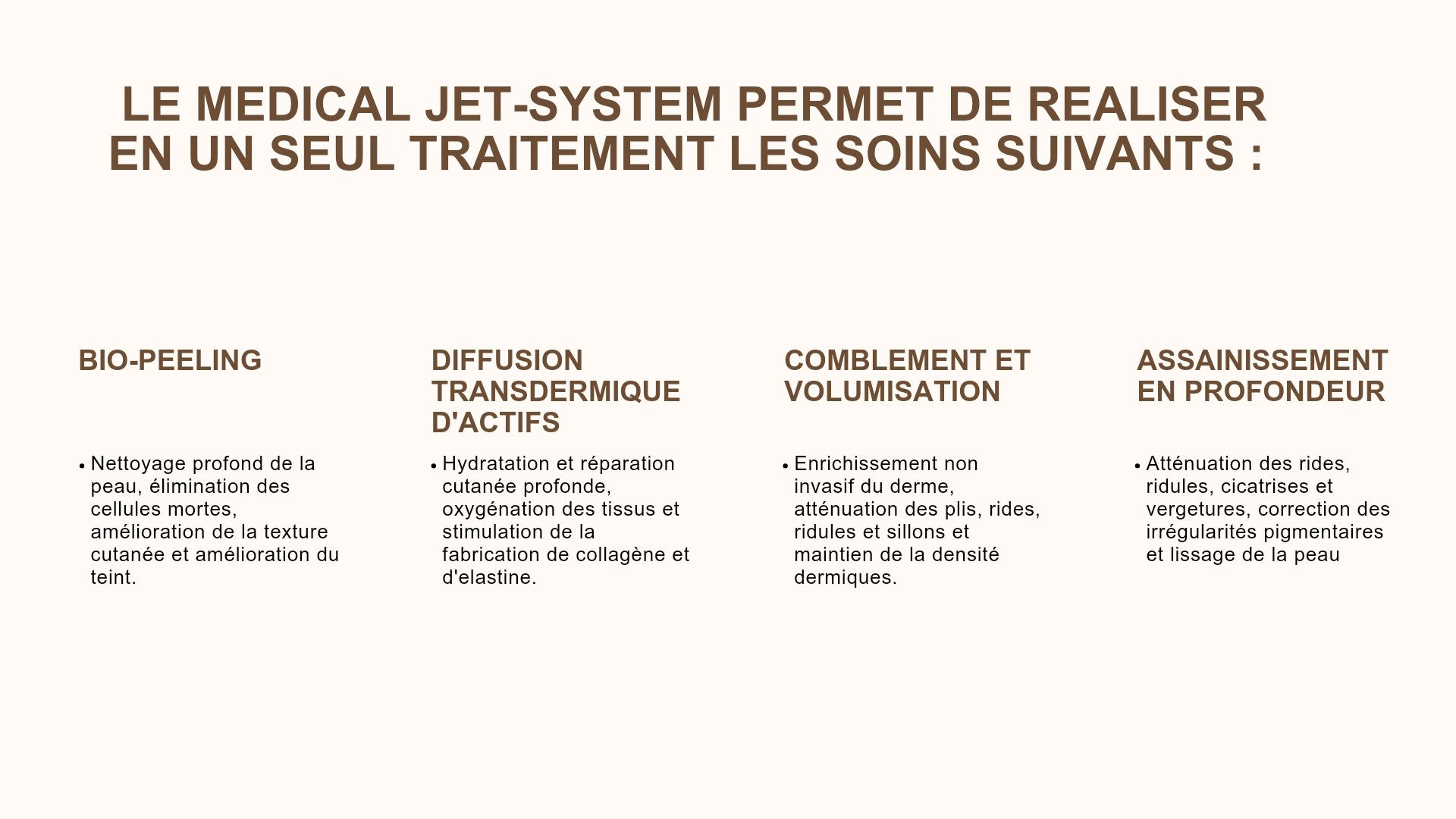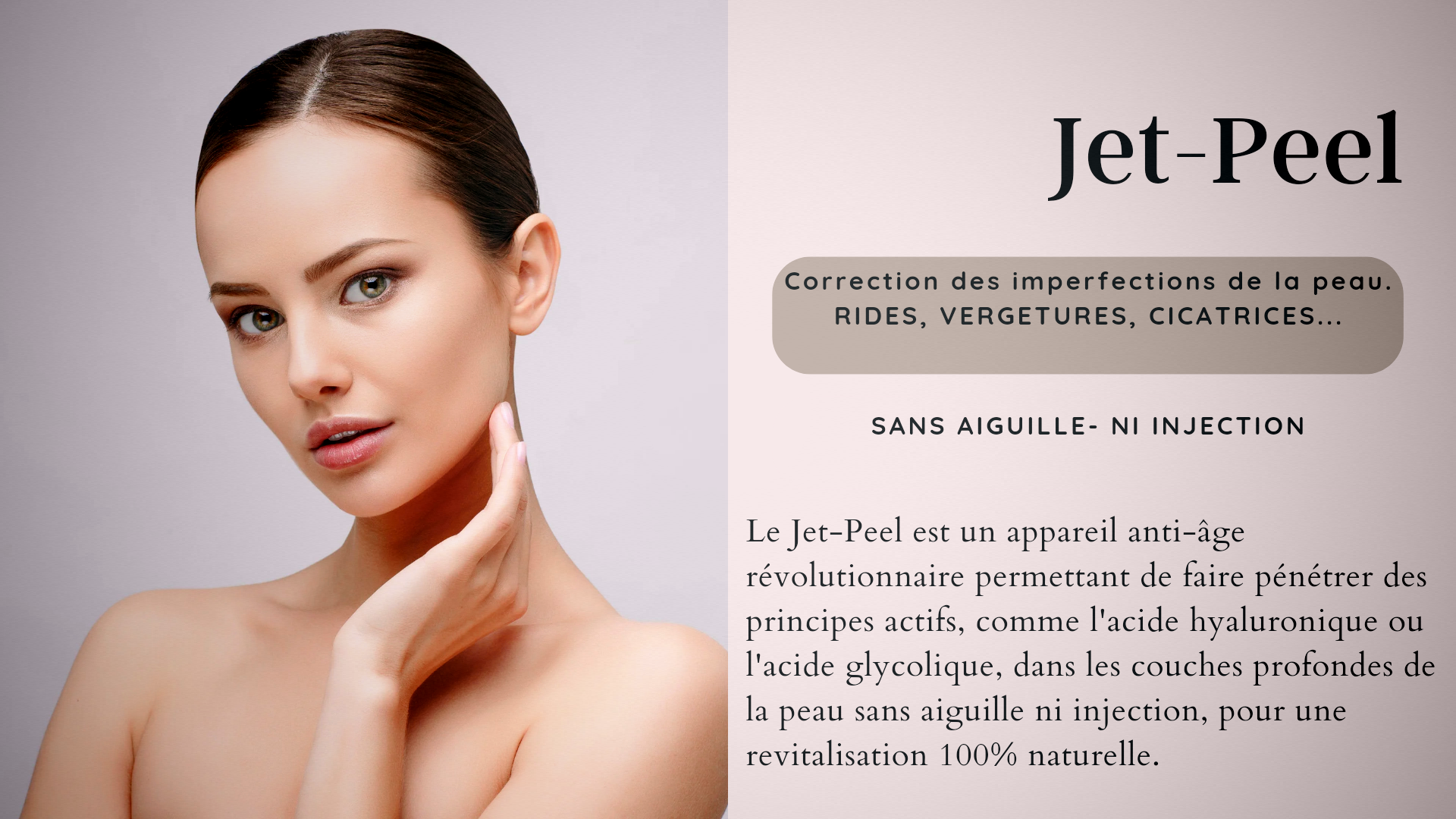 Notre technique de revitalisation 100 % naturelle permet de traiter la peau en surface et en profondeur. Grâce au Jet System®, on peut corriger les imperfections cutanées, combler les rides au niveau du visage, du cou, du décolleté, des mains… En quelques séances, la peau est réhydratée, lissée et retrouve un éclat naturel de jeunesse.